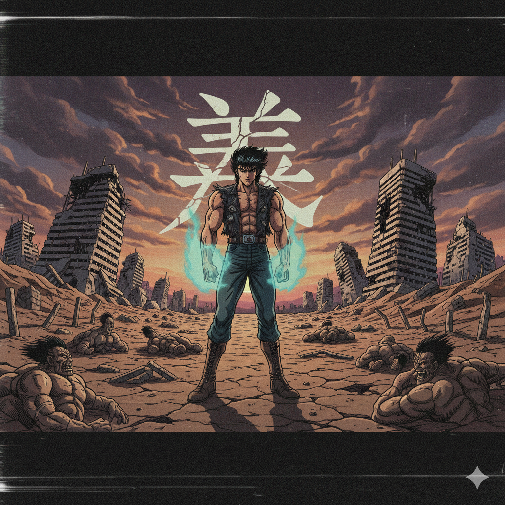 Kenshiro não é apenas um lutador: ele é a última chama de humanidade num mundo engolido pelo caos.